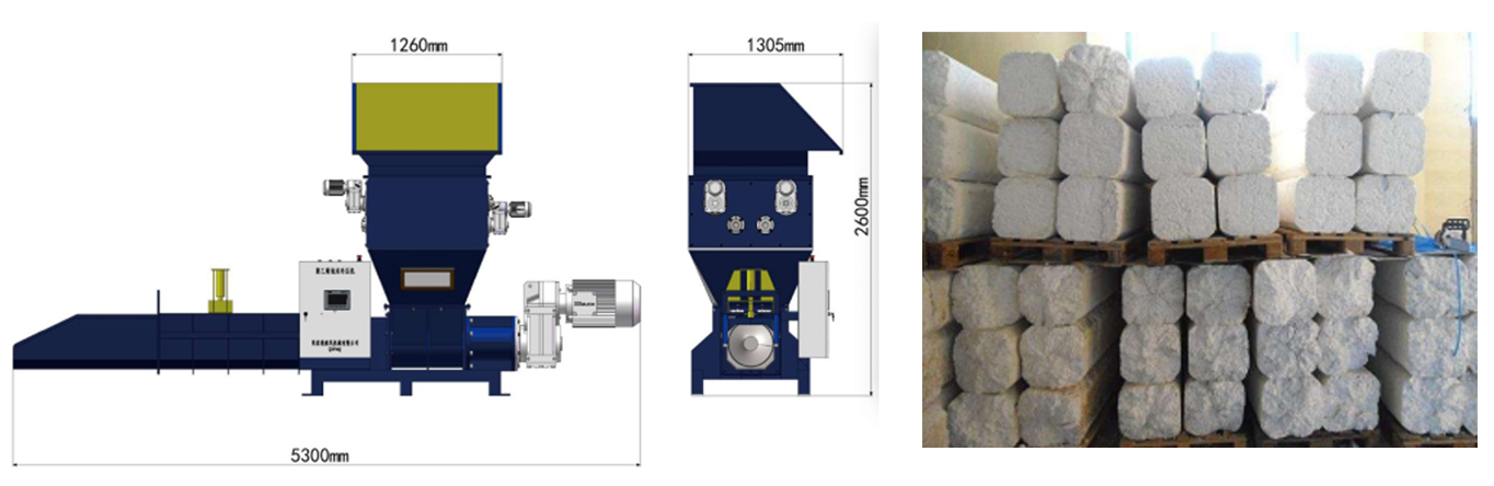 秦風機械的EPS泡沫冷壓機就是用來解決這個問題的,它可以減少EPS泡沫塑料材料的大小,壓縮比可以達到1:30-1: 50。壓縮的成品是EPS泡沫塑料塊,其密度可達300kg/m3,很容易把EPS泡沫塑料材料處理成另一種回收處理形態。